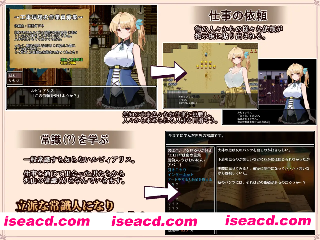■游戏概要 少女露比爱丽丝,从小在某个组织中被灌输成为骑士所需的知识和力量,并以此方式被培养长大。 然而有一天,随着局势发生巨大变化,骑士制度被废除了。 成为骑士的梦想就此破灭,她也被组织抛弃了。 露比爱丽丝一直只接受训练,连基本的常识都没能好好学到,却突然被抛到了社会上。 她不知道自己能做什么…… 甚至不知道该做什么。 但是,为了生存,她必须工作。 她尝试了各种各样的工作,可缺乏常识的她,会全盘接受别人说的话…… ■游戏规格 类型 工作探索 RPG 基本 CG 约 50 张 包含差分共 250 张以上 ■信息更新 2021年7月21日 BUG修复 版本1.01 修复了导致游戏无法进行的错误。 阅读全文 资源下载下载价格VIP专享仅限VIP下载升级VIP立即购买 常见问题 解压密码错误?点击查看》PS:如果提示密码错误,推荐使用Bandizip解压或修改后缀为zip 有些人是因为解压密码复制错误,请手动扩选解压密码,不要直接点复制。 0 0