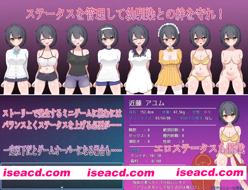 作品内容 从乡下来到东京的本作主人公《佐藤健一》。他一直对与自己一同从故乡搬来的青梅竹马《近藤步》怀有好感。 在未能传达心意的状态下度过一年后,某天,一位轻浮的转学生《森村三郎》到来。从那天起,步的样子就有些不对劲了……? 雪上加霜的是,父亲突然来袭。若不能在限定期限内提升智力(学习成绩?),就要被带回老家……! 健一能否守住与步共同的生活……? 难度可选择。 包含全解锁开关。 角色介绍 近藤步 健一的青梅竹马。是一位男孩子气的美少女,很受女生欢迎。 虽然也有许多男生对她怀有恋慕之情,但由于其性格让人感觉像男性朋友,所以她本人并未察觉自己受欢迎。 平时基本大大咧咧,但偶尔流露出的女孩子气会让周围的雄性蠢蠢欲动。 森村三郎 新学期转学过来的轻浮男。 利用转校生的身份,图谋将步弄到手。 佐藤健一 本作主人公。与步从小一起长大,现在放学后也常去她的房间玩,保持着良好的关系。 她与健一之间的距离尤其近,有时甚至会抱住他那已变得富有女性魅力的身体,每逢此时健一都拼命保持理性。