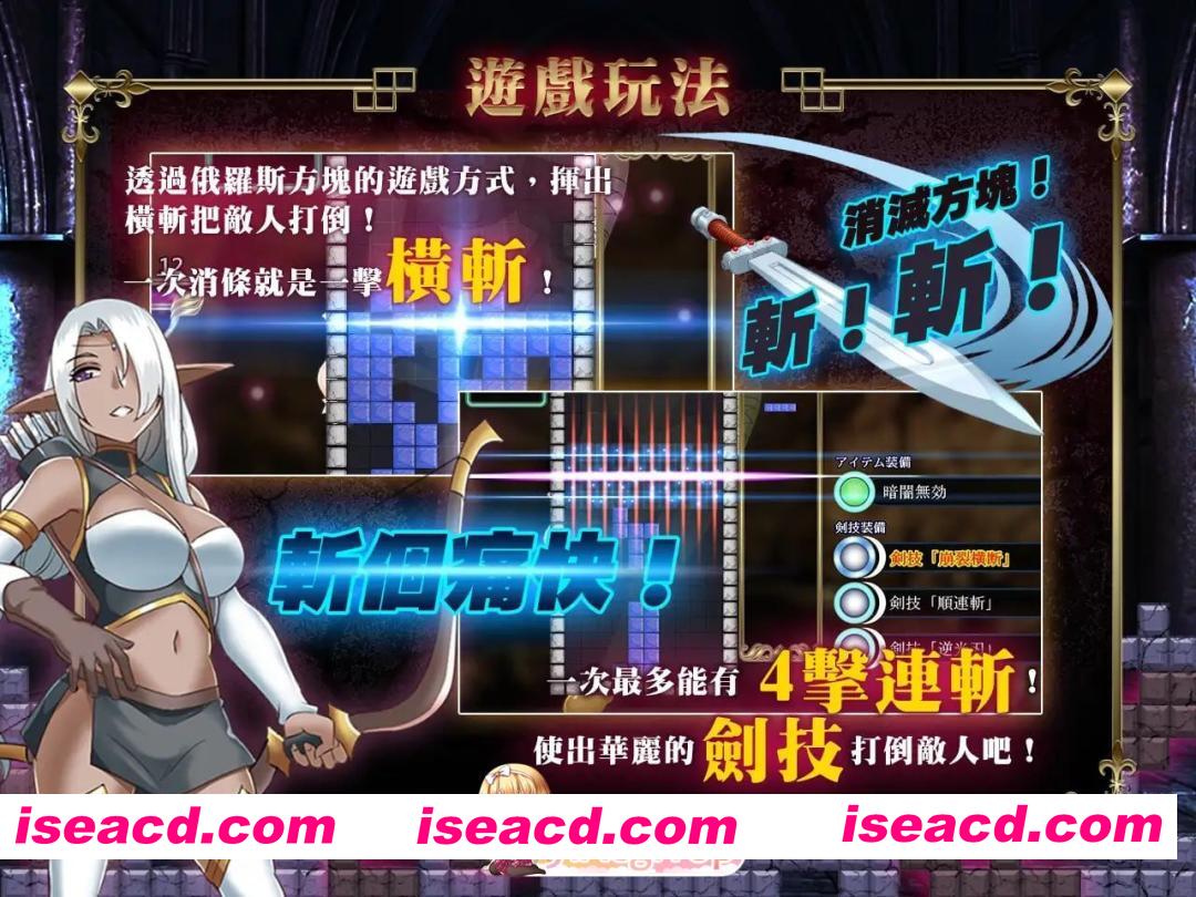透过俄罗斯方块的游戏方式,挥出横斩,把敌人打倒。