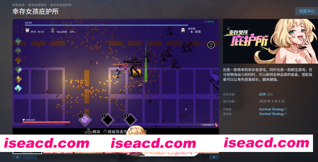 游戏特色: 最原始的幸存者玩法: 游戏采用最传统的幸存者玩法,击败怪物,拾取经验,升级选择技能,主技能与副技能搭配可以得到质变的强大必杀技。 简单的暗黑刷宝玩法: 我们制作了超过100种不同类型的装备,玩家在刷怪的同时可以刷出不同品质的各种装备,这些装备拥有随机属性,随机词条,威能效果和套装效果。 简单粗暴的养成玩法: 购买装备,刷新词条,升级技能,升级天赋,游戏中包含简单又直接的养成途径,无需动脑,点击即可变强。 其他内容: 游戏中通关可以解锁新的角色,角色拥有自己特色的技能体系。 每位女主角可进行5段不同的特殊剧情,四位女主角共20段特殊剧情。