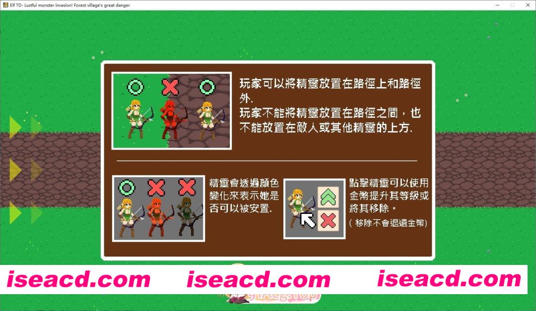 传统的幻想塔防游戏。使用金币来配置和强化精灵,保护她们的故乡免受淫邪魔物的侵害。